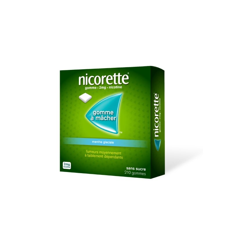 Nicorette 2 mg Menthe Glaciale contient de la nicotine dans une gomme à mâcher pour lutter contre les symptômes de manque liés à la diminution ou à l'arrêt du tabac.